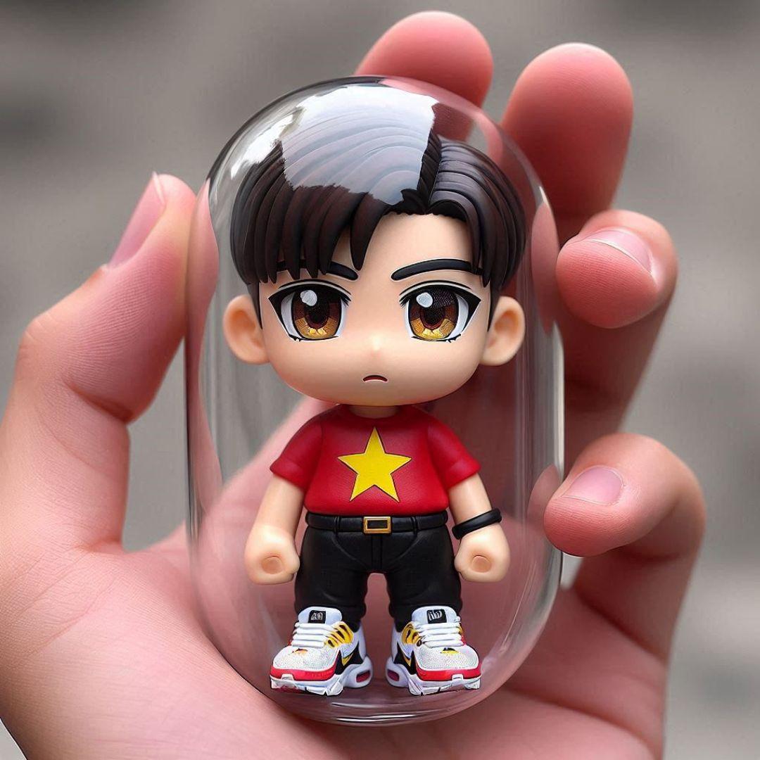 Create a asian boy, sitting on a chair and looking at his phone. The boy is wearing blue t-shirt, pants, and sneakers, and is engrossed in their phone.
